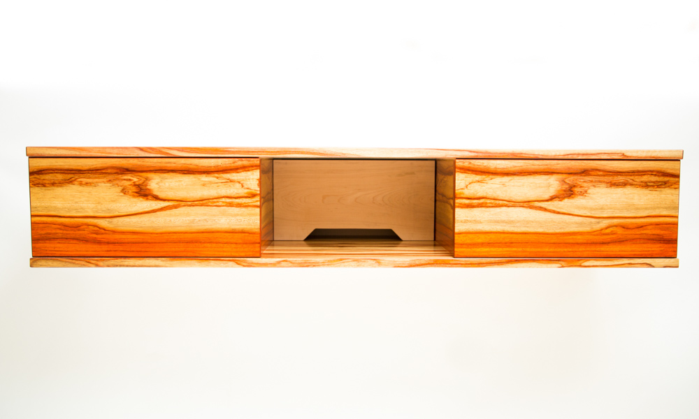 A custom cabinet of Marbled Padauk to hold entertainment electronics. Three push eject drawers. Matching and wrapping grain.