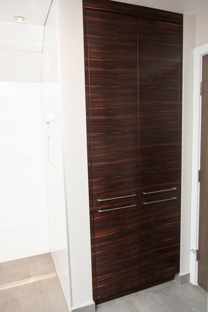 It’s nice to hear from our past clients, especially when they are interested in remodeling a bathroom. A look through our veneer catalog brought them to a wonderful South American wood, Tineo. Four doors, three drawers, no pulls., One custom bathroom cabinet